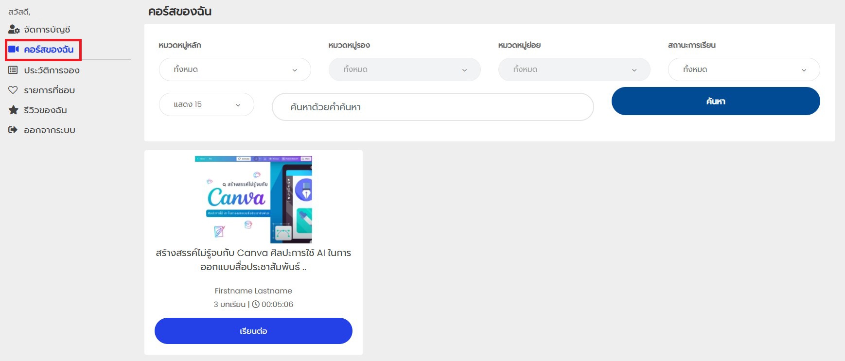 7. ตรวจสอบข้อมูลการจองคอร์สเรียน โดยคลิกปุ่ม "คอร์สของฉัน"